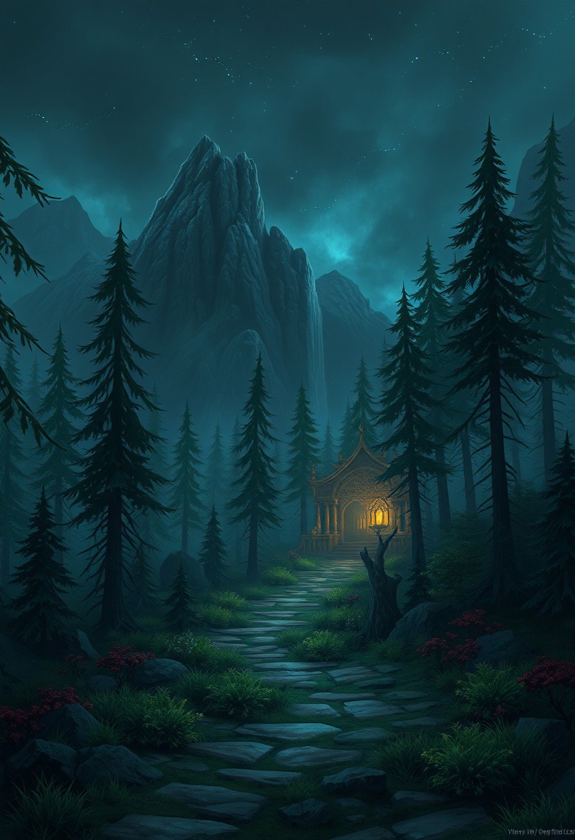 fantasy style, warcraft, video games, forest, night, mountains, path,