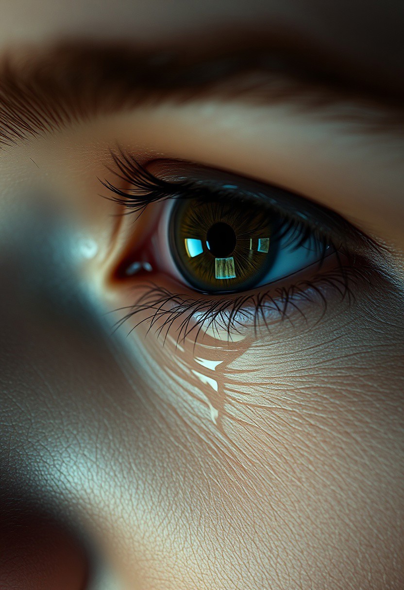 ultra-detailed close-up of a woman's eye, extremely realistic, high resolution, cinematic lighting, glistening tears welling up and rolling down her cheek, soft reflections in the iris, emotional expression, macro photography style, sharp focus on eyelashes and skin texture, dramatic mood, shallow depth of field, skin pores visible, 8k, photorealism