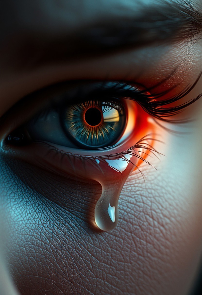 ultra-detailed close-up of a woman's eye, extremely realistic, high resolution, cinematic lighting, glistening tears welling up and rolling down her cheek, soft reflections in the iris, emotional expression, macro photography style, sharp focus on eyelashes and skin texture, dramatic mood, shallow depth of field, skin pores visible, 8k, photorealism