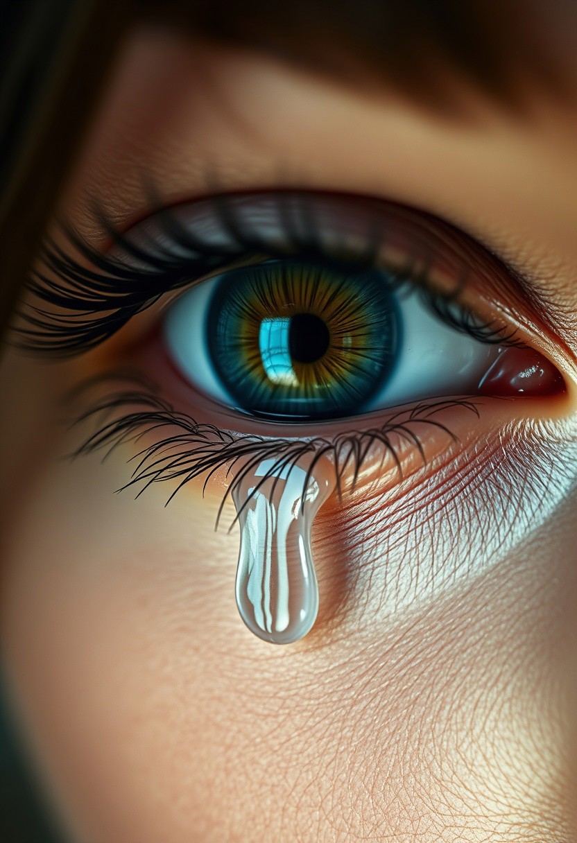 ultra-detailed macro shot of a single woman's eye, sharp focus on iris and eyelashes, crystal-clear teardrop forming and falling from the lower eyelid, tear reflecting light, cinematic close-up, photorealistic textures, moist skin, soft natural lighting, emotional intensity, perfectly symmetrical eye, shallow depth of field, skin pores and tiny facial hairs visible, 8k resolution, extreme realism
