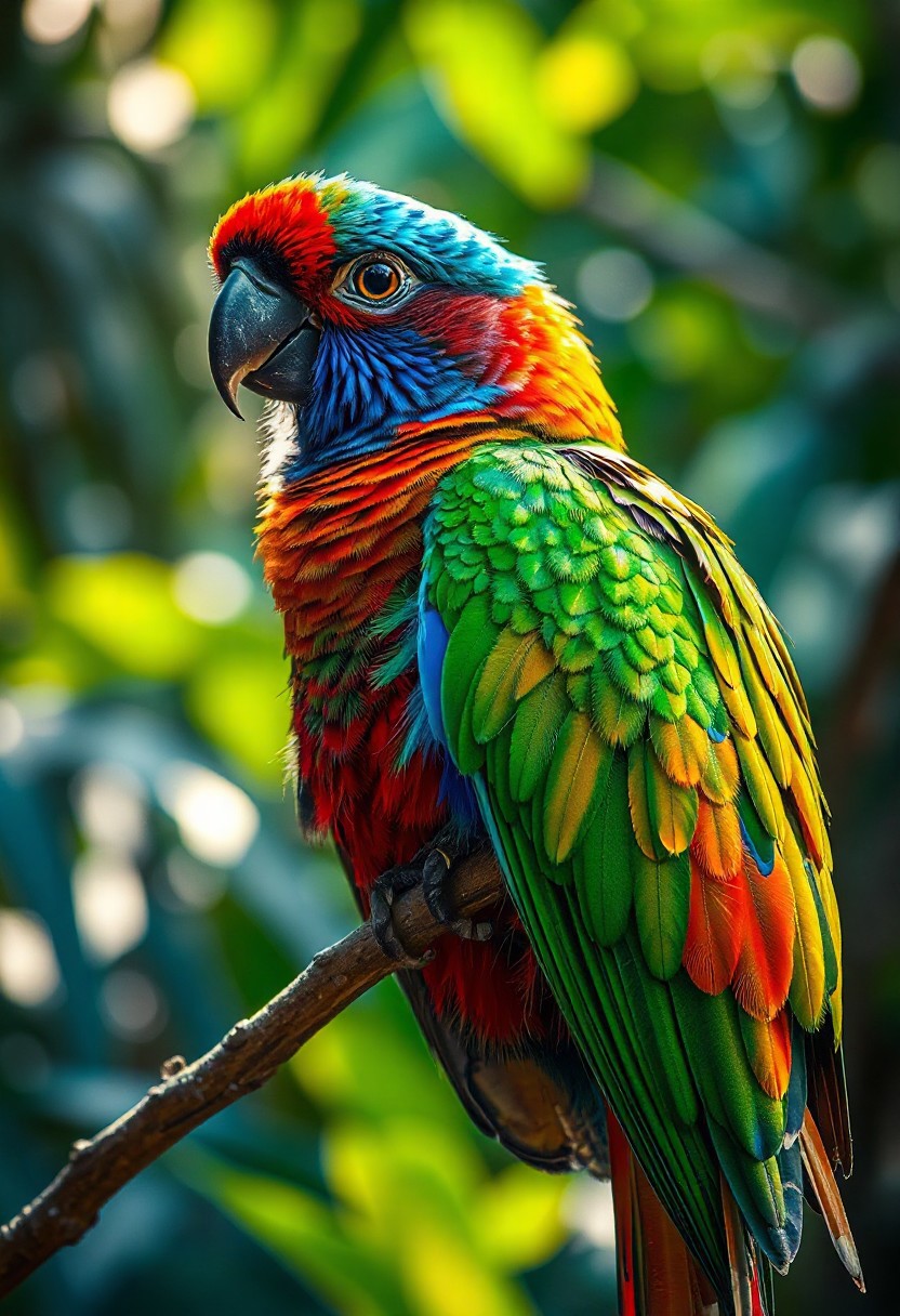 A majestic, ultra-detailed tropical bird perched on a branch, feathers shimmering in a spectrum of vibrant colors — sapphire blue, emerald green, ruby red, and golden yellow — iridescent and glowing in soft sunlight, hyper-realistic texture, intricate feather patterns, sparkling eyes, lush jungle background with blurred depth of field, photorealistic, 8k, award-winning wildlife photography style