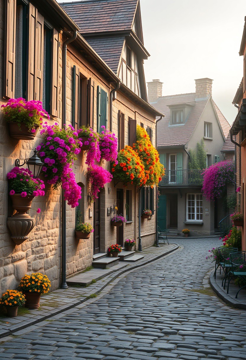 An old charming European-style village, cobblestone streets, rustic stone houses with wooden shutters, covered in vibrant and colorful flowers cascading from window boxes and garden edges, soft morning light, gentle mist, warm pastel tones, dreamy and peaceful atmosphere, highly detailed, ultra-realistic, 8k