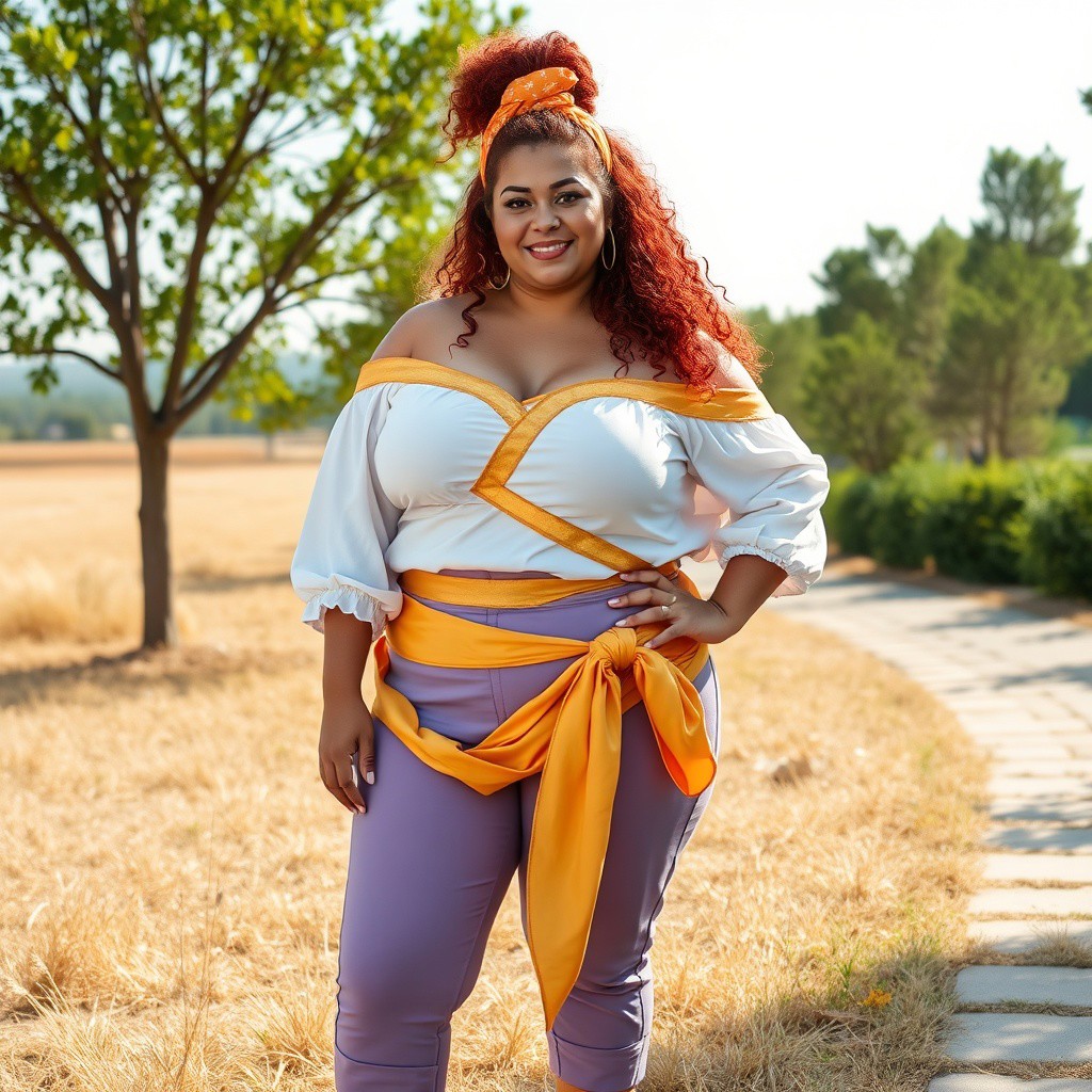 masterpiece portrait of Portia-inspired plus-size cosplayer::1.4, stylized realism::1.2, cosplay fantasy art::1.1, (physical description: plus-size woman with red/auburn curly hair in a high ponytail, orange-yellow patterned headband:1.1), (facial features, expression: confident pose, direct gaze or expressive smile, natural makeup:1.0), (clothing details: white off-shoulder blouse with gold trim, yellow/gold wrap sash over lavender cuffed pants, black flats:1.0), (accessories: orange patterned headband, gold sash or belt tied at waist:0.9), (background setting: outdoor dry grassy field, leafy green tree to the left, paved path on the right, distant trees/shrubs in background:0.9), (lighting style: bright natural sunlight casting soft shadows:0.8), (composition and camera framing: full-body centered composition, slight low angle to enhance presence, strong vertical stance:1.0), (emotional tone or theme: vibrant, playful, fantasy-meets-reality cosplay moment:0.9), (technical execution: crisp rendering of fabric textures and costume details, dynamic lighting on natural and manmade elements:0.8)
