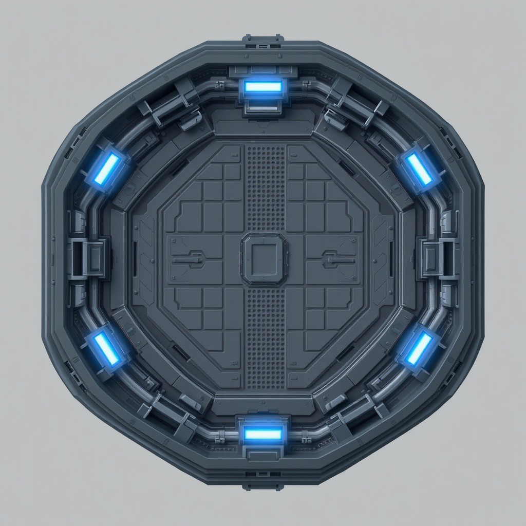 2d game scene, game asset, 2d top-down map view of a sci-fi spaceship interior floor tile, perfectly centered, geometric flat-topped hexagon shape, clean lines, intricate details. A straight corridor with metal grating floor, glowing blue light strips along the edges, pipes and conduits on the sides. Industrial, utilitarian style. Isolated on a neutral grey background.