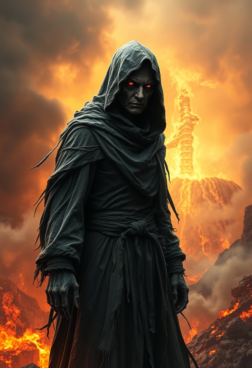 A wizened, ashen sorceress cloaked in ragged, soot-stained robes, standing defiantly against a fiery, apocalyptic backdrop. Her hood conceals a face etched with age and fury, eyes glowing faintly like embers. In full combat mode, her form appears more skeletal and smoke-wreathed, as if her body is held together by sheer will and dark magic. Her robes flutter like burnt paper in the heat, and her aura radiates ancient wrath. The sky behind her churns with volcanic ash and flame, casting her in stark silhouette. Cinematic fantasy concept art, ultra-detailed, with dramatic lighting and a sense of unstoppable arcane force.