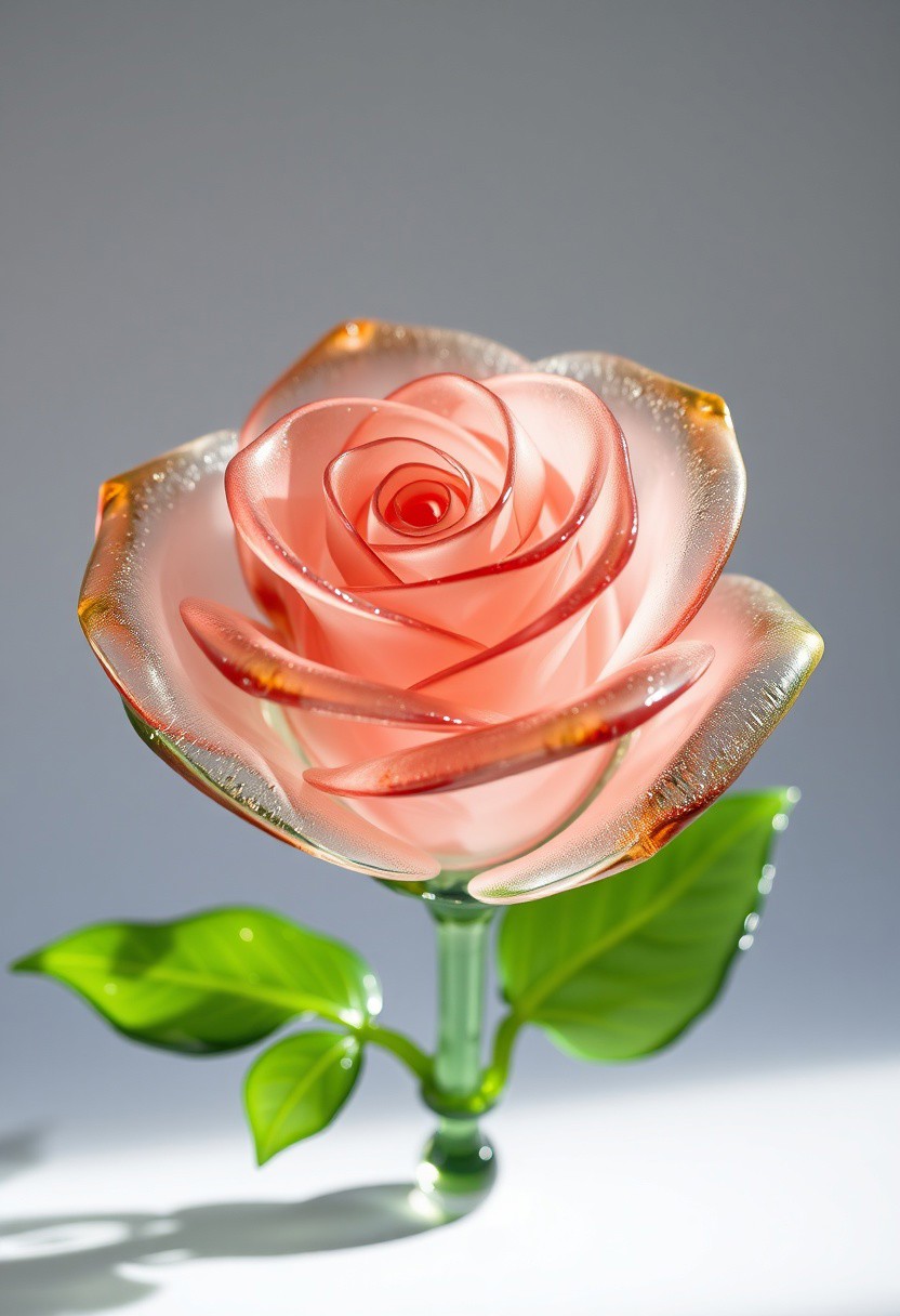 (masterpiece), best quality, expressive eyes, perfect face A blown glass rose is a stunning work of art that captures the essence and beauty of nature's most iconic flower. This exquisite piece is handcrafted by skilled glassblowers who manipulate molten glass into intricate, delicate petals and lush green leaves. The translucent hue of the glass gives it an ethereal quality, allowing light to filter through its petals in mesmerizing patterns. Each individual bloom has unique textural variations, ranging from smooth and silky to rough and textured, adding depth and character to each creation. When displayed in natural or artificial lighting, the blown glass rose seems almost alive, evoking the sensory experience of holding a real rose in your hands. It is truly a masterful representation of both science and art, making it a cherished addition to any collection or decor scheme.
