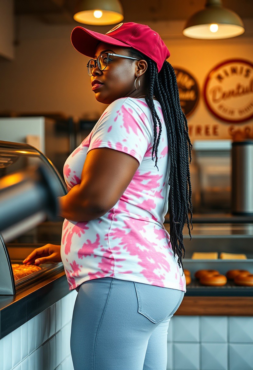 masterpiece portrait of a full-length side view of a size 20 mature white woman::1.4, realistic documentary photography style::1.2, ultra-detailed art::1.1, (physical description: curvy, plus-size frame, cornrow braids, glasses, loosely inspired Soft heart-shaped face with hooded doe eyes, a broad-tipped nose, and full upper lip—youthful yet quirky:0.5:1.1), (facial features, expression: neutral, focused expression while working:1.0), (clothing details: fitted ball cap, white and pink tie-die T-shirt, light blue yoga pants:1.0), (accessories: bright pink strap thick soled sandals showing perfectly pedicured toes:0.9), (background setting: behind the counter of a doughnut shop, glass display case of pastries, warm indoor lighting:0.9), (lighting style: soft warm light from overhead fixtures, subtle shadows:0.8), (composition and camera framing: side profile full-length shot, slightly low angle:1.0), (emotional tone or theme: casual, everyday realism:0.9), (technical execution: sharp focus, natural color balance, realistic textures on skin, clothing, and shop elements:0.8)