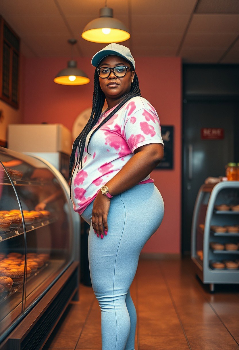 full body shot masterpiece portrait of a full-length side view of a size 20 mature white woman::1.4, realistic documentary photography style::1.2, ultra-detailed art::1.1, (physical description: curvy, plus-size frame, cornrow braids, glasses, loosely inspired Soft heart-shaped face with hooded doe eyes, a broad-tipped nose, and full upper lip—youthful yet quirky:0.5:1.1), (facial features, expression: neutral, focused expression while working:1.0), (clothing details: fitted ball cap, white and pink tie-die T-shirt, light blue yoga pants:1.0), (accessories: bright pink strap thick soled sandals showing perfectly pedicured toes:0.9), (background setting: behind the counter of a doughnut shop, glass display case of pastries, warm indoor lighting:0.9), (lighting style: soft warm light from overhead fixtures, subtle shadows:0.8), (composition and camera framing: side profile full-length shot, slightly low angle:1.0), (emotional tone or theme: casual, everyday realism:0.9), (technical execution: sharp focus, natural color balance, realistic textures on skin, clothing, and shop elements:0.8)