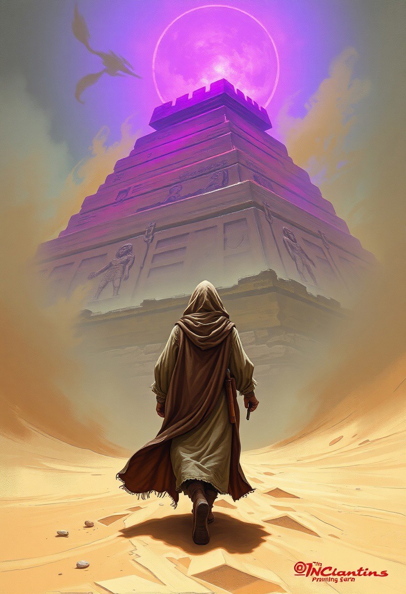 A desert-robed wanderer strides through a sandstorm toward a buried ziggurat whose apex glows with eerie violet light. Each gust reveals carved effigies of forgotten gods on the dune-slid walls., dndpntng style vintage fantasy painting, 1980s RPG style, hand painted with dramatic shadows and fantasy details, <lora:dnd-painting_v10:1>