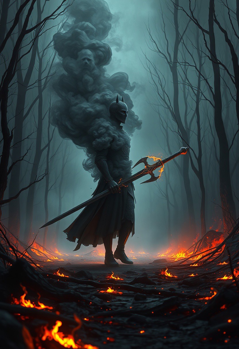 High fantasy illustration of a Knight made of smoke and ash wandering in a charred forest, dragging a massive sword along the ground. Embers glow softly. Dynamic lighting enhances the scene's eerie beauty. Detailed, intricate, fantasy concept art, 4k resolution, trending on Artstation, dark, ethereal, haunting, best quality.