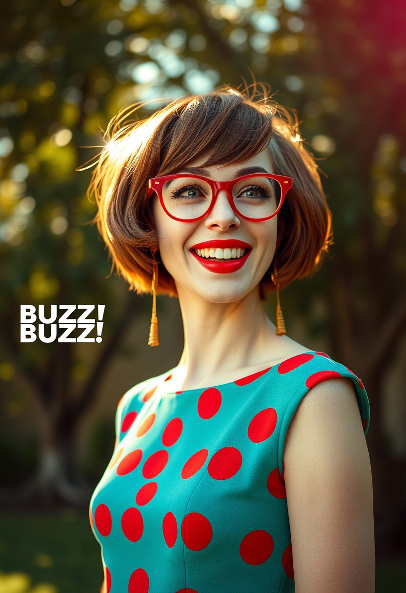 Photorealistic portrait of a petite quirky woman with a surreal 1960s aesthetic. She has a short chin length, tousled chestnut bob haircut, pale skin, and is wearing red cat-eye glasses. Her makeup is dramatic with glossy bright red lipstick, thick eyeliner, and arched brows. She is smiling wide with an exaggerated laugh, her expression playful and ironic. She wears a vintage fit-and-flare dress with a bold retro print — polka dots or geometric shapes — in bright colors like cherry red or teal. Dangling mid-century style gold earrings. She stands outside in soft sunlight, trees blurred in the background. The photo has a slightly overexposed, sun-kissed look with vintage lens flare and bokeh. Add light film grain and slight chromatic aberration for a dreamy analog effect. Style inspired by a 1960s television commercial or a surreal David Lynch dream sequence. Text on screen says “BUZZ BUZZ!” in Helvetica, floating near her. Keywords: vintage fashion, retro glam, 1960s, surreal humor, pastel color palette, photorealism, film grain, quirky feminine energy, kitsch, dreamlike vibe