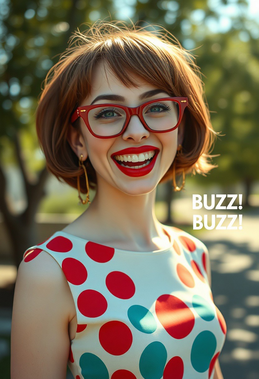 Photorealistic portrait of a petite quirky woman with a surreal 1960s aesthetic. She has a short chin length, tousled chestnut bob haircut, pale skin, and is wearing red cat-eye glasses. Her makeup is dramatic with glossy bright red lipstick, thick eyeliner, and arched brows. She is smiling wide with an exaggerated laugh, her expression playful and ironic. She wears a vintage fit-and-flare dress with a bold retro print — polka dots or geometric shapes — in bright colors like cherry red or teal. Dangling mid-century style gold earrings. She stands outside in soft sunlight, trees blurred in the background. The photo has a slightly overexposed, sun-kissed look with vintage lens flare and bokeh. Add light film grain and slight chromatic aberration for a dreamy analog effect. Style inspired by a 1960s television commercial or a surreal David Lynch dream sequence. Text on screen says “BUZZ BUZZ!” in Helvetica, floating near her. Keywords: vintage fashion, retro glam, 1960s, surreal humor, pastel color palette, photorealism, film grain, quirky feminine energy, kitsch, dreamlike vibe