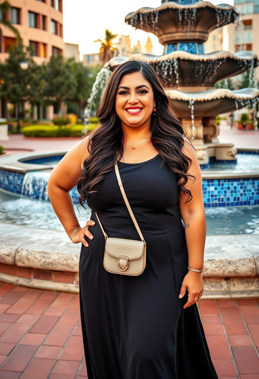 masterpiece portrait of a radiant woman with long dark wavy hair::1.4, candid photography style::1.2, naturalistic portrait art::1.1, (physical description: full-figured woman, long dark brown wavy hair cascading over shoulders, standing tall and confident:1.1), (facial features, expression: warm and genuine smile, kind brown eyes, pleasant and relaxed expression:1.0), (clothing details: elegant sleeveless black maxi dress with a scoop neck, simple yet flowing fabric:1.0), (accessories: small light-colored cross-body purse, white strap sandals, subtle necklace, red stud earrings:0.9), (background setting: grand tiered stone fountain with vibrant blue mosaic tiles and cascading water, red brick basin, terracotta tiled walkway, hints of lush greenery and modern buildings:0.9), (lighting style: soft ambient daylight, golden hour glow, gentle and even illumination, no harsh shadows:0.8), (composition and camera framing: full-body portrait, subject centrally positioned with one hand on hip, dynamic fountain backdrop, eye-level perspective:1.0), (emotional tone or theme: serene, joyful, confident, summery evening atmosphere:0.9), (technical execution: crisp focus, rich color palette, sharp details, inviting depth of field:0.8).