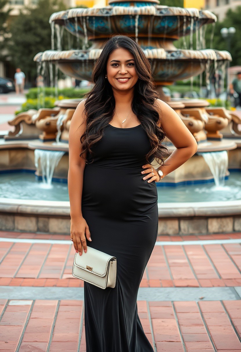 masterpiece portrait of a radiant woman with long dark wavy hair::1.4, candid photography style::1.2, naturalistic portrait art::1.1, (physical description: full-figured woman, long dark brown wavy hair cascading over shoulders, standing tall and confident:1.1), (facial features, expression: warm and genuine smile, kind brown eyes, pleasant and relaxed expression:1.0), (clothing details: elegant sleeveless black maxi dress with a scoop neck, simple yet flowing fabric:1.0), (accessories: small light-colored cross-body purse, white strap sandals, subtle necklace, red stud earrings:0.9), (background setting: grand tiered stone fountain with vibrant blue mosaic tiles and cascading water, red brick basin, terracotta tiled walkway, hints of lush greenery and modern buildings:0.9), (lighting style: soft ambient daylight, golden hour glow, gentle and even illumination, no harsh shadows:0.8), (composition and camera framing: full-body portrait, subject centrally positioned with one hand on hip, dynamic fountain backdrop, eye-level perspective:1.0), (emotional tone or theme: serene, joyful, confident, summery evening atmosphere:0.9), (technical execution: crisp focus, rich color palette, sharp details, inviting depth of field:0.8).