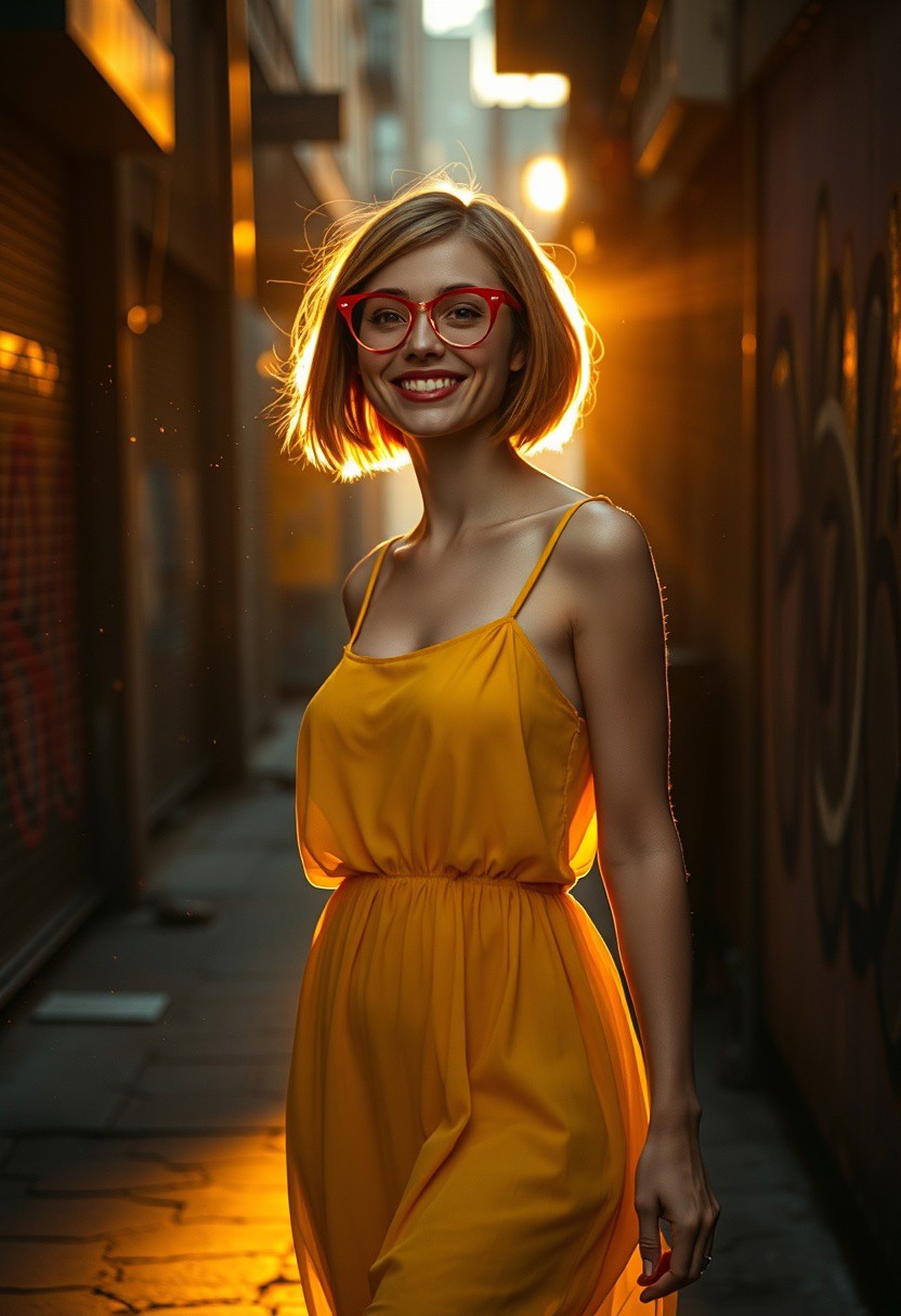 Prompt (FLUX style) A slightly tall, petite woman with fair skin, short auburn bob hair, and playful red cat-eye glasses, walking confidently through a gritty urban alley at golden hour. She wears a short yellow sundress with spaghetti straps, made of a soft, slightly sheer fabric that catches the warm sunset light. Her figure is illuminated with perfect rim lighting, the sun forming a glowing outline around her shoulders and dress. Dust particles float in the air, backlit by long golden rays. The background is dark and urban, with cracked pavement, graffiti, and out-of-focus elements. Her expression is joyful and radiant, with cinematic lighting on her face, glowing skin, and light bouncing through her hair. The scene has strong color contrast, bokeh-rich depth, and a dreamy, editorial tone. Style Tags: photorealistic, FLUX model, cinematic lighting, golden hour, urban fashion, realistic skin texture, sunset rim light, dreamy bokeh, backlit dust particles, flowing fabric, slightly taller, vintage glasses, street fashion photography, analog tones Negative Prompt (optional for Civitai): blurry, cropped face, low resolution, bad hands, poorly lit face, overexposed, unnatural pose, cartoon, 3D, anime, distorted proportions