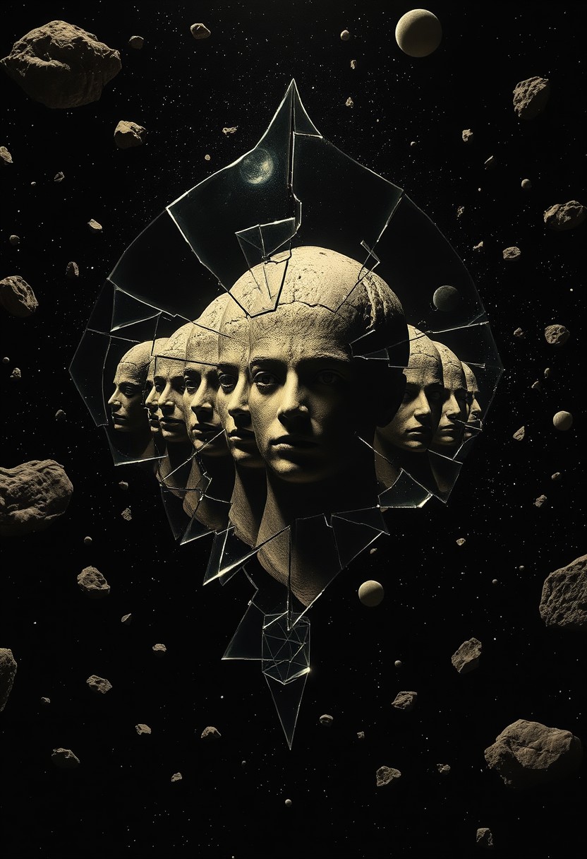 - A shattered mirror in space reflecting multiple versions of the same human face as planets/hybrids, floating through an asteroid field - Influenced by the works of Magritte & Dali - Dreamlike chiaroscuro lighting and shattered symmetry