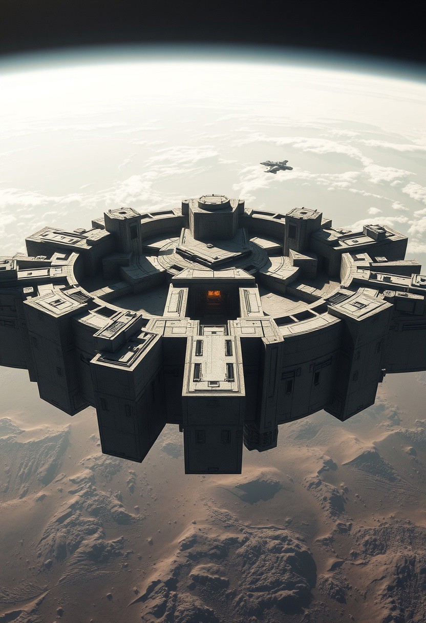 A colossal orbital fortress drifts above a barren moon, its structure designed with severe minimalism and monumental proportions. Massive interlocking concrete-like slabs form walls, towers, and bridges, their surfaces textured with faint imperfections that enhance their realism. Vast voids and open courtyards break the solidity, allowing shafts of light to cut through, casting razor-sharp shadows that shift with planetary rotation. The design is geometric and timeless, as though carved from a single colossal block of stone, embodying both futuristic technology and ancient monumentality. No ornamental details clutter the surface; instead, the fortress speaks through silence, proportion, and scale. In the distance, docking bays glow faintly, hinting at the fortress’s hidden strength. A fleet of small spacecraft approaches, dwarfed by the immense architecture. The background reveals a planet’s surface below, bathed in pale light, with swirling clouds and deep oceans visible. The visual tone is cinematic and hyper-realistic, emphasizing sharp contrasts between illuminated planes and shadowed recesses. The camera perspective is from a spacecraft’s approach, framing the fortress as a dominant structure filling the horizon. The atmosphere suggests solitude, serenity, and indomitable power suspended in orbit above eternity.