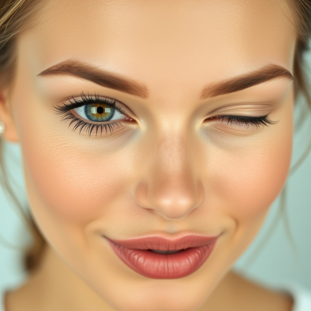 beautiful woman, lighthearted, close and open the eyelid of one eye, Purse lips to mimic a blowing motion, close up on lips and eyes,