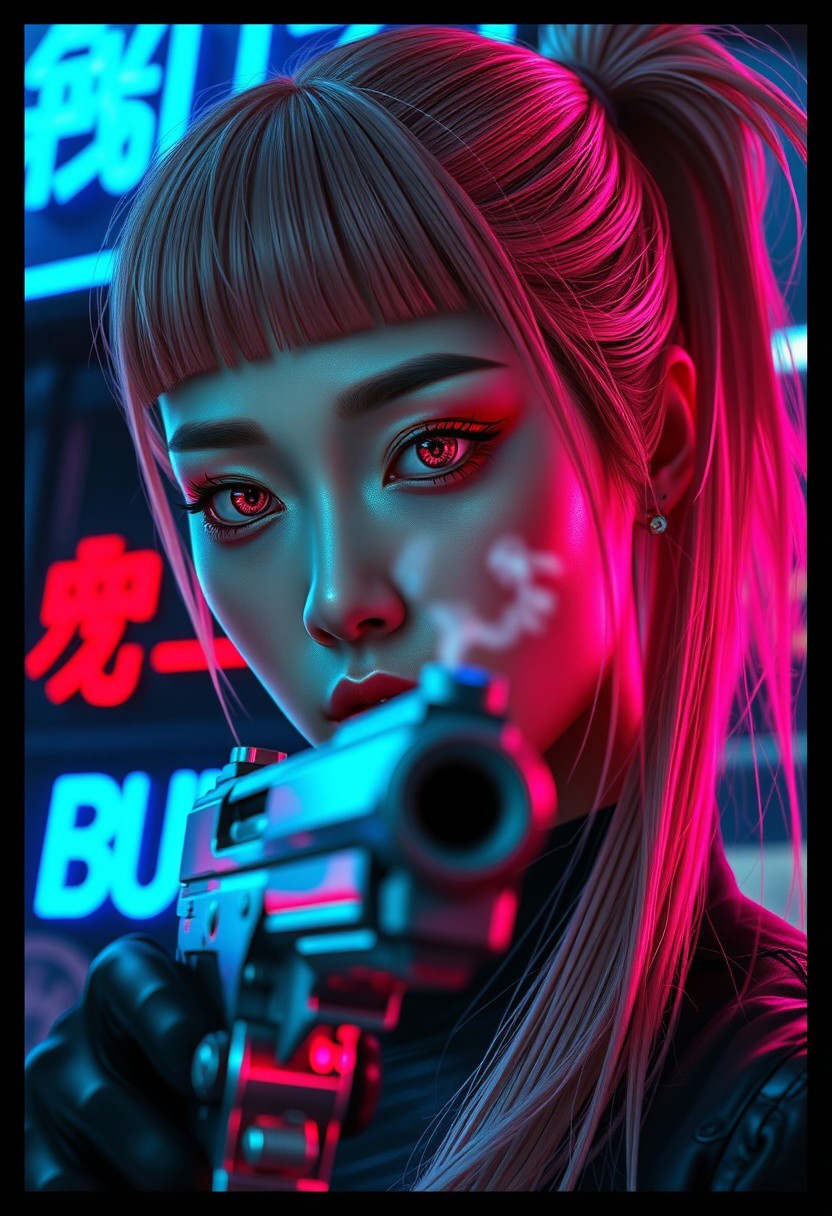 Photorealistic vertical movie poster of a tall, slender Japanese cyberpunk assassin. Extreme close-up portrait, her face fills most of the frame. She has long blush pink hair in a high ponytail, with brushed bangs and loose strands framing her face. Her expression is cold and controlled. Her cybernetic eyes glow faint pink with intricate tech circuitry visible in the irises. She wears bold, sharp red Asian-style eyeshadow. At the bottom edge of the frame, the silver barrel of a futuristic pistol is visible, slightly out of focus and pointed at the viewer. A delicate plume of smoke rises from the barrel, drifting across her porcelain face. Lighting is dramatic and cinematic — a neon-noir palette of deep shadows with vibrant pink, blue, and purple rim lights. Her chrome cybernetic hand is just out of frame. In the blurred background: a blue neon sign reading ‘BUZZ’, with red Japanese katakana beneath it. The poster has a framed black border. At the top, bold stylized title text: BUZZ KILLER — glowing neon-style font Below it, in smaller red type: The Sakura Killer.” Style Tags: photorealistic, cyberpunk, movie poster, neon noir, futuristic assassin, glowing eyes, cinematic lighting, Camera Framing: Close-up portrait, vertical orientation, Lighting: Pink/purple neon bounce, deep shadows, realistic glow effects