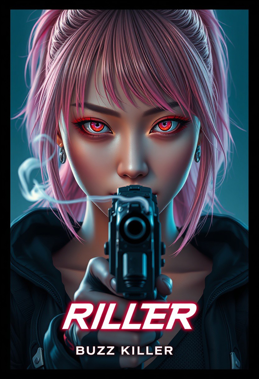 Photorealistic vertical movie poster of a Japanese cyberpunk assassin. The frame is tightly cropped — her face and gun completely fill the poster. She is Atsuko Suzuki, tall and slender, with blush pink hair in a high ponytail, brushed bangs, and loose strands framing her intense face. Her cybernetic eyes glow faint pink, with hyper-detailed circuitry in both irises:1.8. She wears bold red Asian-style eyeshadow. Her black futuristic pistol is centered at the bottom of the frame, pointed directly at the viewer, slightly blurred. A thin plume of smoke curls upward from the barrel, drifting across her pale, focused face. The lighting is cinematic — cool neon glow on her skin and metallic edges, deep shadow in her contours. There is no visible background, just clean black borders framing the image like a movie poster. Text overlays: Top of the poster: Atsuko Suzuki is Centered at the bottom in bold neon-style type: BUZZ KILLER”