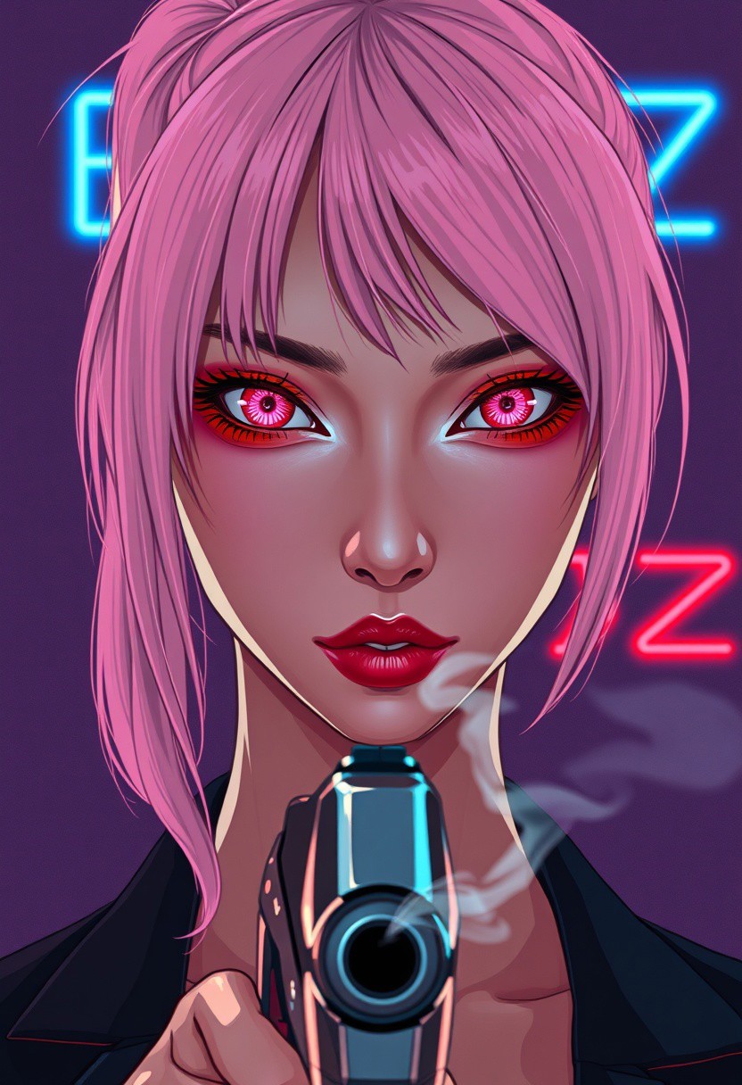 Close-up ((movie poster)) of a tall, slender Japanese cyberpunk assassin, in a semi-realistic style with subtle Patrick Nagel-inspired stylization. Her face fills the horizontal frame, staring coldly at the viewer. She has long blush pink hair in a high ponytail with side-swept bangs and loose strands framing her face. Her cybernetic eyes are highly realistic with glowing faint pink irises, intricate circuit patterns visible in the iris, styled like high-end anime eyes but with real-world texture. She wears bold red Asian-style eyeshadow, stylized with clean, sharp application reminiscent of Nagel’s graphic look. At the bottom edge of the frame, a silver pistol barrel is visible, slightly blurred, pointed toward the viewer. A thin plume of smoke curls upward, softly cutting across her face. Lighting is dramatic — realistic but with high contrast and graphic shadows along her jawline, cheekbones, and collarbone. The background is minimalist: flat muted violet or black with a blue neon “BUZZ” sign and red Japanese characters subtly blurred in the distance. Title overlay text “BUZZ KILLER” in bold 1980s-style neon lettering (hot pink or electric blue), Subtitle text“The Sakura Killer” in thin red Japanese-style type beneath.” ⸻ Style Notes: • Blend: 90% cinematic realism, 10% Nagel flat styling (hair, makeup, shadows, composition) • Mood: Neon-noir, sleek, cold elegance • Model Type: Realistic or semi-stylized (e.g., cinematic anime fusion)