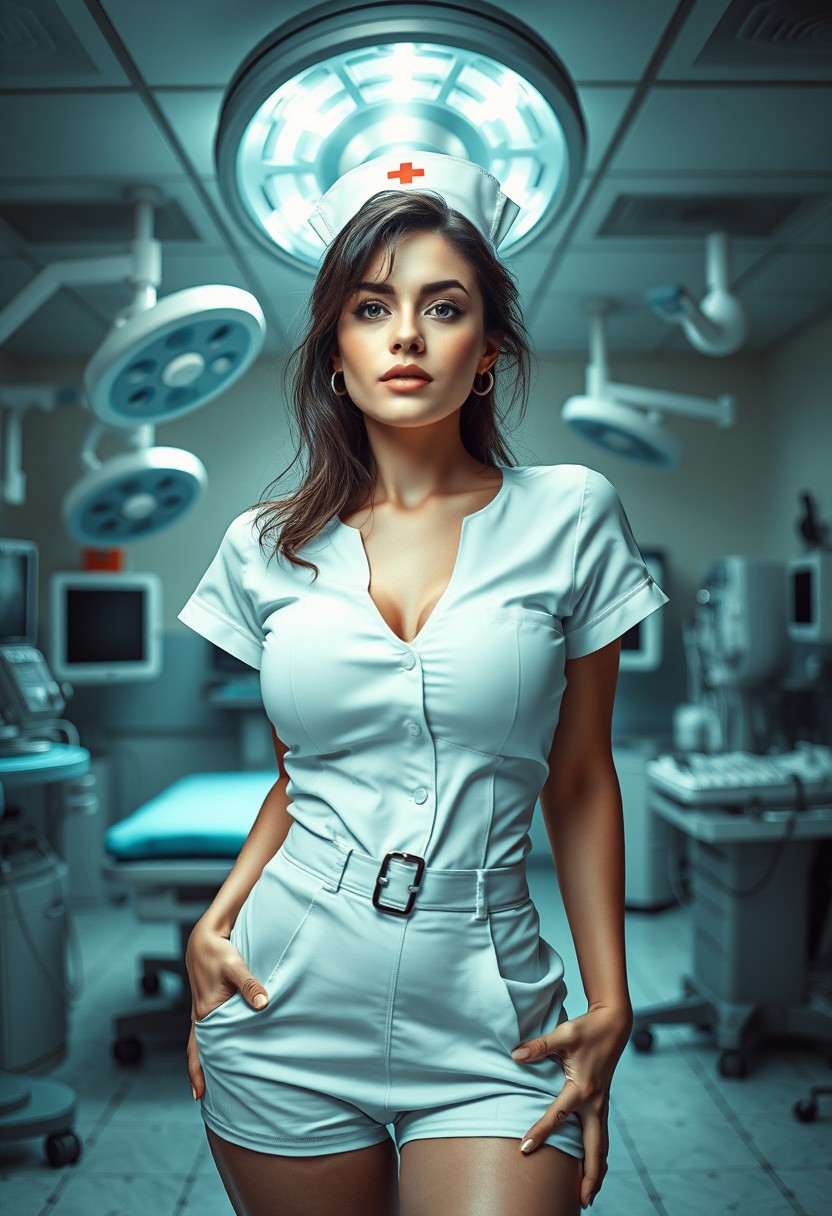 masterpiece, Hyperrealistic, dynamic angles, multiple angles, photoshoot poses; A photo of Naughty_nurse, headshots, a woman, she has ivory white colored skin,she has huge breasts, busty breasts, she is wearing a white nurses uniform, she is in a delapidated operating room, the room is filled with surgical equipment, posed. well-lit environment, subsurface scattering, a playful and whimsical,