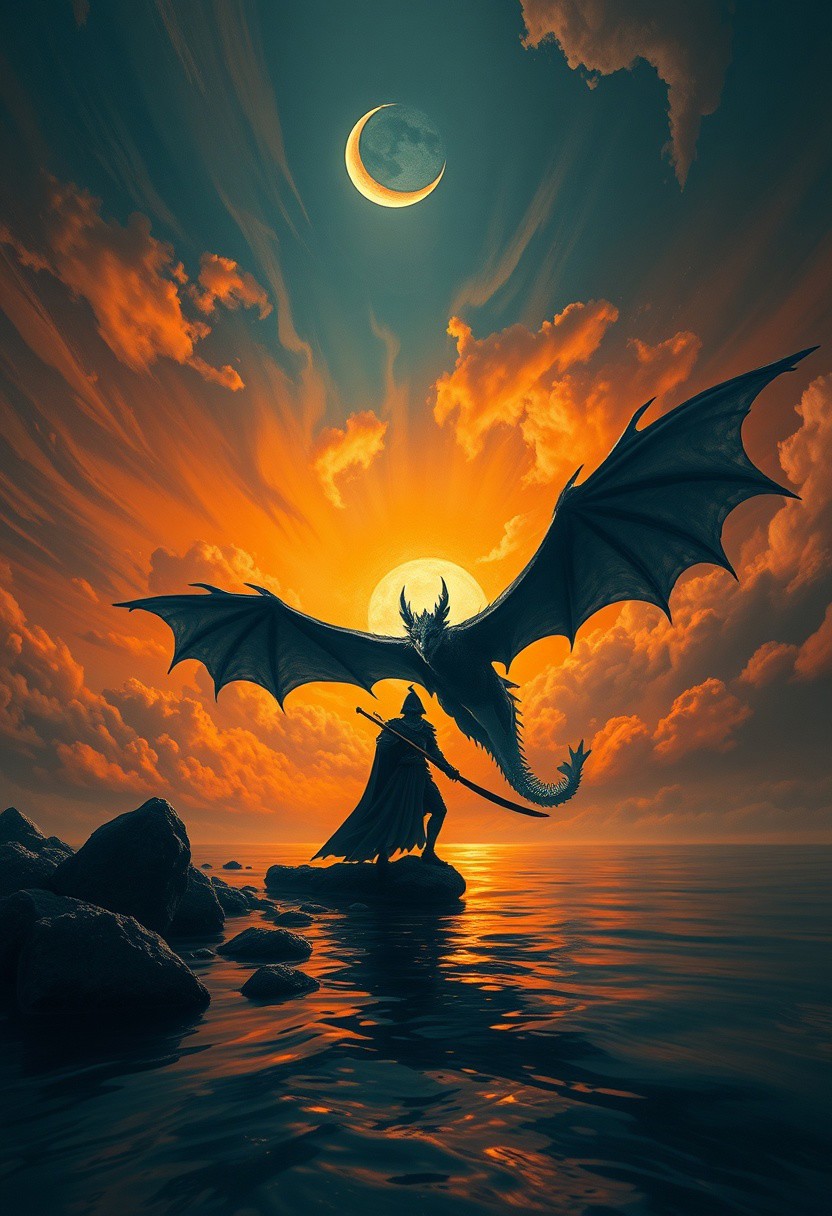 A low angle closeup, captivating, dramatic scene in a painting that exudes mystery and foreboding. A dark orange navy sky, swirling clouds, and a crescent moon illuminate a fearless warrior against the massive flying black dragon near the water's edge, silhouetted against the eerie glow. The water mirrors the navy orange sky and moonlight, amplifying the stunning atmosphere. This vibrant, cinematic work of conceptual art creates a haunting impression., vibrant, conceptual art, painting, dark fantasy, cinematic