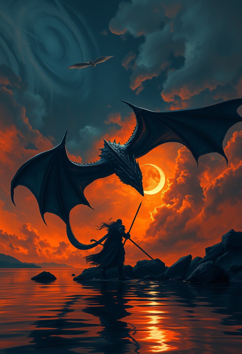 A low angle closeup, captivating, dramatic scene in a painting that exudes mystery and foreboding. A dark orange navy sky, swirling clouds, and a crescent moon illuminate a fearless warrior against the massive flying black dragon near the water's edge, silhouetted against the eerie glow. The water mirrors the navy orange sky and moonlight, amplifying the stunning atmosphere. This vibrant, cinematic work of conceptual art creates a haunting impression., vibrant, conceptual art, painting, dark fantasy, cinematic