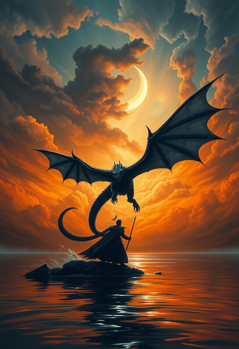 A low angle closeup, captivating, dramatic scene in a painting that exudes mystery and foreboding. A dark orange navy sky, swirling clouds, and a crescent moon illuminate a fearless warrior against the massive flying black dragon near the water's edge, silhouetted against the eerie glow. The water mirrors the navy orange sky and moonlight, amplifying the stunning atmosphere. This vibrant, cinematic work of conceptual art creates a haunting impression., vibrant, conceptual art, painting, dark fantasy, cinematic