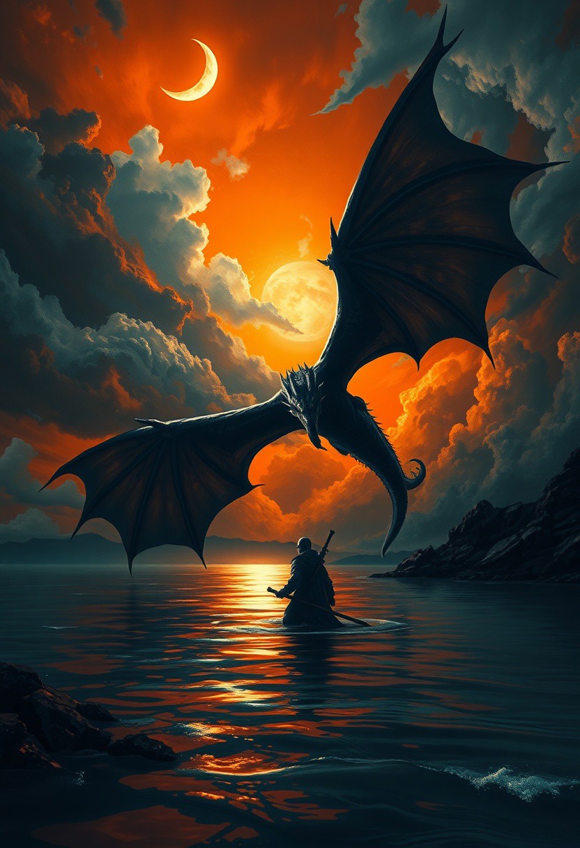 A low angle closeup, captivating, dramatic scene in a painting that exudes mystery and foreboding. A dark orange navy sky, swirling clouds, and a crescent moon illuminate a fearless warrior against the massive flying black dragon near the water's edge, silhouetted against the eerie glow. The water mirrors the navy orange sky and moonlight, amplifying the stunning atmosphere. This vibrant, cinematic work of conceptual art creates a haunting impression., vibrant, conceptual art, painting, dark fantasy, cinematic